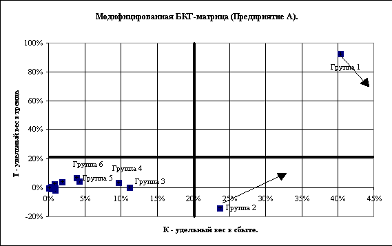На графике предприятия А квадранты получены путем разделения поля по значениям Т и К, равным 20%. При таком делении, сохраняя терминологию БКГ, имеем ярко выраженную “звезду” - Группа 1 (правый верхний квадрант), “денежную корову” - Группа 2 - с очевидной тенденцией к угасанию (Т<0), и россыпь “собак” - левый нижний квадрант - разной степени значимости. Очевидно, что стратегические усилия предприятия, могут быть в таком случае направлены на “оживление” Группы 2 при максимальном внимании к “звезде”. Стрелками на графике показаны ожидаемые (планируемые) изменения в матрице после воплощения соответствующей стратегии - например, модификация или репозиционирование продуктов Группы 2, либо усиление мероприятий по продвижению, либо другой актуальный маркетинг-микс. Повторное составление матрицы через определенный период времени (после выполнения тактических мероприятий маркетинга) позволяет проследить “дрейф” каждой группы по квадрантам или кластерам, оценить эффективность принятых решений и действий, а также вовремя уловить позитивные и негативные тенденции развития для каждой группы продукта. Другими словами, применение модифицированной матрицы может быть полезным в процессе контроллинга.