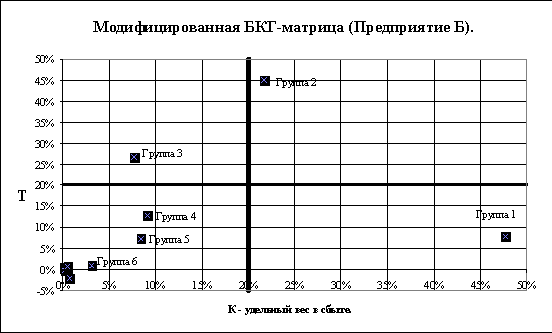 Аналогичная процедура (разбиение по линиям К=20% и Т=20%) для Предприятия Б дает другую картину - вполне жизнеспособная “корова” - Группа 1, достаточно яркая “звезда” - Группа 2, “знак вопроса” - Группа 3, и, как обычно - стайка “собак”. С последними, впрочем, следует вести себя достаточно дифференцированно. При ближайшем рассмотрении оказалось, что в левом нижнем квадранте при почти одинаковых численных значениях К и Т (около нуля), в группу “собак” попадают принципиально разные группы продукта. Первые - классические продукты в конце жизненного цикла, с отрицательным темпом роста и малым объемом сбыта, требующие деинвестирования и исключения из ассортимента. Вторые - наоборот, инновационные продукты в стадии рыночного теста на ограниченном рыночном пространстве. Последние требуют выделения в особую инновационную группу и включаются в общую матрицу только после принятия принципиального (стратегического) решения об их развитии.
