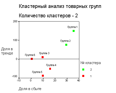 Ниже, например, представлены результаты кластерного анализа товарного ассортимента предприятия при количестве кластеров, равном 2. Это означает, что все товарные группы предприятия мы таким образом разделили на две неравные части - “главные” и “остальные”.