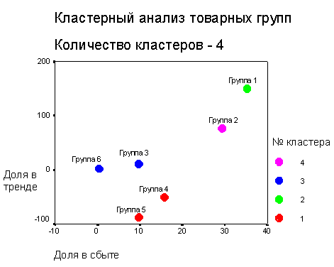 При разделении же общего ассортимента на четыре клстера (что равно традиционному количеству квадрантов в матричном подходе) получаем четыре возможные сходные стратегии, применямые к определеному количеству товарных групп, входящих в общий кластер.