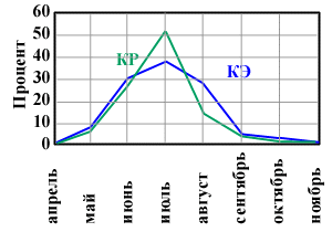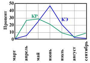 Рис.2. Сравнительная динамика сезонности заболеваний КР и КЭ в республике Алтай