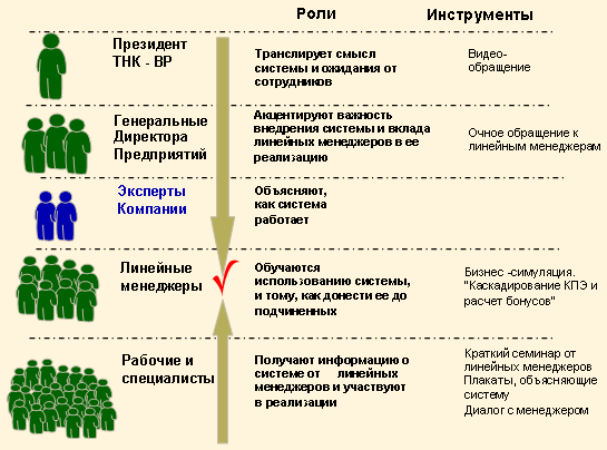 1. Идеологический блок. Включал в себя видео-обращение Президента компании ТНК-ВР Роберта Дадли, в котором он рассказывал о смысле и задачах новой системы, роли менеджмента и сотрудников в ее внедрении, а так же очное вступительное слово Генерального директора предприятия, посвященное конкретным ожиданиям к менеджерам – участникам конференций по отношению к задаче внедрения новой системы. В результате линейные менеджеры понимали важность, цель внедрения и свою роль в этом процессе.