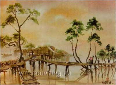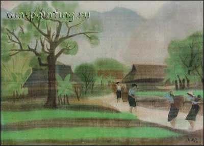 Любой вьетнамец – это действительно патриот своей земли, знающий названия практически каждой горы или речки, каждого красивого цветка. Вьетнамские художники, когда пишут природу, то пытаются не скопировать с натуры какой-либо пейзаж, а передать свои личные переживания от созерцания красоты родной страны, выразить свою искреннюю любовь к бесконечному величию и многообразию природы. Наиболее изысканными изобразительными качествами отличается пейзажная живопись на шёлке. Сам материал позволяет показать тончайшие нюансы цвета, передать изменения, происходящие в пейзаже из-за погодных явлений. Нгуен Тхи Там в своей «Деревенской сценке» изображает утренний пейзаж после дождя. Деревья отражаются в мутной глинистой воде залива, а линия горизонта скрыта туманной дымкой. На первом плане картины – деревянные покосившиеся мостки, ведущие к скромным деревенским домам. Перед нами поэтичный образ своенравной природы, с которой вьетнамцы привыкли жить в согласии. Дома практически залиты водой, а дети беззаботно веселятся, раскачиваясь на мостках.
