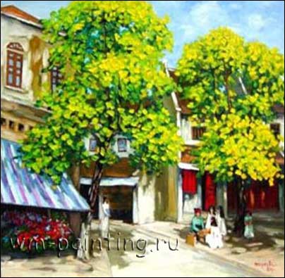 Безупречной красотой жёлтого и синего цвета мы можем любоваться в картине «Деревья осенью», написанной маслом художником по имени Ле Тханх. Некоторые современные художники Вьетнама настолько увлечены красотой локальных цветов, что создают целые сезонные циклы пейзажей. Таков, например, Лам Дак Манх, создавший цикл из более, чем двадцати картин, изображающих центральную улицу в Ханое в разное время суток и года. Цвет позволяет охарактеризовать краски определённого сезона, передать зрителю ощущение горячего лета или прохладной зимы. Такие работы пользуются огромным спросом у европейских и американских коллекционеров и предпринимателей, а потому практически при каждой галерее Ханоя работает мастер, который может выполнить на заказ любой заинтересовавший заказчика вид в определённой цветовой гамме. К сожалению, не всегда картина, выполненная таким образом, обладает чертами действительно высокого искусства. Стоит, однако, признать, что и заказчик, и художник как правило наделены хорошим вкусом, поэтому арт-индустрия Вьетнама редко опускается до уровня ремесленных поделок. Покупатели вьетнамского искусства – это в основном европейская интеллигенция и крупные французские предприниматели, потомки аристократических семей тех влиятельных деятелей, что вели дела в азиатской колонии. Может показаться весьма странным тот факт, что бывшие агрессоры и оккупанты вкладывают во вьетнамскую экономику значительные средства, проявляют к Вьетнаму больше дружеского внимания, чем бывшие единомышленники и партнёры. Во Франции, например, практически каждый год проходят выставки и ярмарки вьетнамских художников.