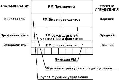 Горизонтальные срезы структуры представляют уровни управления (верхний, средний, нижний), квалификацию (универсал, профессионал, специалист). Вертикальные срезы структуры представляют функциональное разделение труда рабочих мест в срезах уровней управления (функции РМ, функции структурных подразделений, группы функций, курируемых вице-президентами). Под уровнем квалификации мы понимаем:
