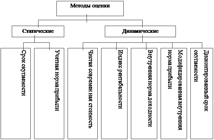 Совокупность методов, применяемых для оценки эффективности инвестиций, можно разбить на две группы: динамические (учитывающие фактор времени) и статические (учетные) как в схеме 3.1.1.