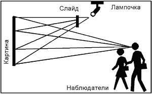 Как из обычного дневного света получить красный луч? Да, конечно, пропустим его через красное стеклышко. А зеленый луч получим с помощью зеленого стеклышка. Но как получить много разноцветных лучей? Очевидно, нужно пропустить свет через множество разноцветных стеклышек. Но, если каждый луч должен четко попадать на соответствующий цвет на картине? Нет ничего проще, чем пропустить свет через точную копию этой картины, а точнее, через ее слайд.