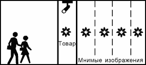 Не трудно заметить: чем меньше угол между зеркалами, тем больше мнимых изображений, и тем больше “видимая” площадь магазина.