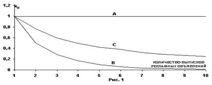 Этот эффект будет определяться коэффициентом известности фирмы-рекламодателя - kи. Для фирм никому неизвестных (например, только что открывшихся) этот коэффициент равен единице. Для известных же фирм он может быть существенно меньше. При постоянной подаче рекламы в данное издание этот коэффициент будет уменьшаться. Причем, для изданий с консервативным способом распространения (при рассылке по подписке) kи будет уменьшаться быстро до уровня, определяемого количеством новых подписчиков издания (за период между предыдущей и следующей подачей рекламы) по отношению к тиражу издания.