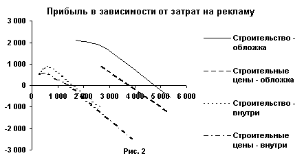 Из приведенных графиков видно, что вложения в рекламу в газете "Строительство" будут оптимальными. Чем большими средствами располагает фирма, тем большую площадь выгоднее взять, однако площадь 225 см2 уже брать невыгодно, вместо этого лучше взять модуль 55 см2 на обложке.