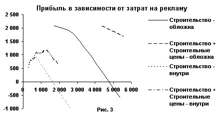 Величины затрат на рекламу в этих случаях приводить не будем, их легко определить из таблицы 3. С учетом возможности подачи рекламы в оба издания построим график зависимости прибыли от затрат на рекламу.