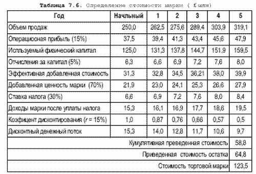 В табл. 7.6 стоимость марки составила 123,5 млн. Из ее прогнозируемых будущих доходов 17% относятся на долю материальных активов, 83% — на долю нематериальных активов, 58% поступают непосредственно за счет марочного названия. Из 123,5 млн стоимости марки 58,8 млн — денежный поток за период планирования, остальное — дальнейшая стоимость, определенная по бессрочному методу Дальнейшая стоимость отражает тот факт, что правильно управляемые марки могут существовать неограниченно долго.
