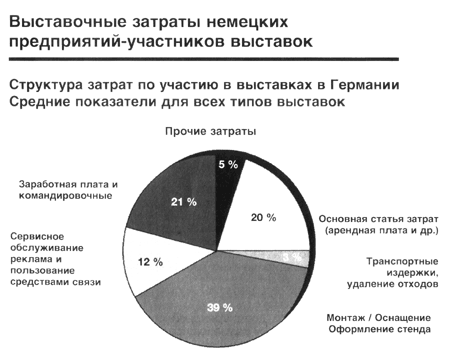 На региональных/местных выставках доля арендной платы за м2 площади стенда значительно выше, чем на крупных международных выставках - в диапазоне от 26% до 10%. Противоположная тенденция характерна для затрат на монтаж стенда - в диапазоне от 25% до 50%. В среднем, сумма затрат в пересчете на квадратный метр площади стенда составляет примерно 1150 DM, с естественными отклонениями в ту и другую сторону в зависимости от типа выставки, размеров предприятия (по численности занятых) и размеров стенда.