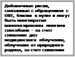 . Речь идет именно о пожизненном риске канцерогенных эффектов действия радиации, при её воздействии на уровнях предельно допустимых (20 мЗв/год для персонала и 1 мЗв для населения дополнительного облучения от техногенных источников). Данные эффекты реализуются в течение десятилетий, поэтому соответствующие годовые радиационные риски будут в 20-30 раз меньше. Если говорить о практической ситуации, то в районах размещения АЭС население получает дозы дополнительного облучения в 20 – 50 раз более низкие, чем 1 мЗв. И даже в районе ПО «МАЯК» дозы облучения населения в 10 раз меньше допустимого предела.