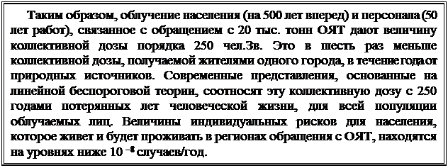 Переработка ОЯТ. Облучение персонала и населения при переработке ОЯТ во многом зависит от совершенства технологии переработки. Оценки, выполненные в консервативном предположении о том, что будут использоваться технологии не лучше уже существующих в России (хранение и переработка на РТ-1), дали суммарную коллективную дозу, связанную с переработкой и хранением ОЯТ, в пересчете на 20 тыс. тонн ОЯТ, порядка 200 чел.Зв, что составляет 0.01 чел.Зв на тонну ОЯТ. Большая ее часть приходится на переработку ОЯТ.