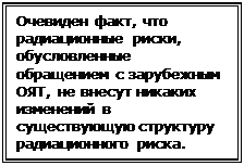 , т.е. ситуация еще в 10 раз хуже. Напомним, что в радиационной безопасности методология оценки риска зафиксирована в санитарно–гигиенических нормативах. Согласно Нормам радиационной безопасности: «Предел индивидуального пожизненного риска в условиях нормальной эксплуатации для техногенного облучения в течение года персонала принимается округленно 1.0*10-3