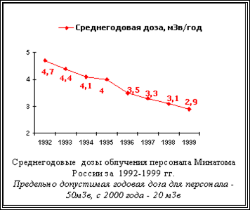Важным интегральным критерием безопасности технологий является безопасность персонала травматизм от всех факторов и профессиональные заболевания. Анализ соответствующих данных показывает, что предприятия Минатома России являются одними из самых безопасных в России по данному критерию. Например, такой сводный показатель, как сутки потерянной жизни за год на одного работающего в отрасли, в Минатоме России в три раза ниже, чем в среднем по России, и более чем в два раза ниже, чем в легкой промышленности. Причем в показатель Минатома России наибольший вклад дают строительные подразделения предприятий. Роль радиационного фактора в этих потерях пренебрежимо мала.