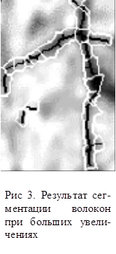 Разработан алгоритм сегментации и отслеживания сосудов и волокон при больших увеличениях. Основная особенность этого алгоритма – это определение объекта по областям, выделенным в результате утоньшения всего изображения, которое обработано оператором выделения границ (например, фильтром Собеля), что позволяет не только увеличить скорость по сравнению с алгоритмами поточечной трассировки, но и получить более качественные результаты на слабоконтрастных изображениях.