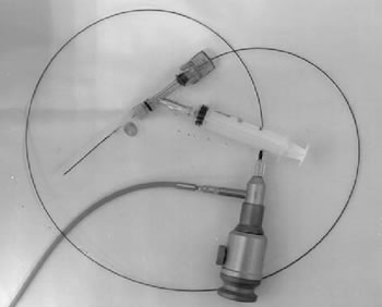 Рис. 1. Гибкий эндоскоп диаметром 0,56 мм (1,7 Fr), У-образный вазограф с двухконечным соединением, и полая игла с калибром канюли - 18.