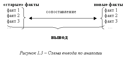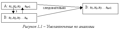 Доказательство по аналогии основано на том, что предметы могут быть подобными, сходными в каких-либо свойствах, признаках или отношениях, причем такие предметы, которые в целом различны. Очевидно, что доказательство по аналогии не является абсолютным, оно гипотетическое. Необходимо отметить, что в умозаключении по аналогии весьма часто вместо слов "вероятно" и "возможно" употребляют слова "следовательно", "значит" (рисунок 1.1).