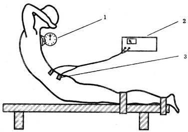 Рис. 1. Методика развития активной гибкости с использованием дополнительной афферентации: 1 - маятниковый гониометр, 2 - электростимулятор, 3 - накожные пластинчатые электроды 2х12 см