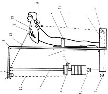 Рис. 2. Тренажер для развития силовой гибкости туловища: 1 - платформа, 2 - направляющие; 3 - рама жесткости, 4 - грузы, 5 - шарикоподшипниковые блоки, 6 - опорная площадка, 7 - ремень крепления (страховки) спортсмена, 8 - пояс с карабинами, 9 - гониометр, 10 - пружинные амортизаторы, 11 - фиксатор грузов, 12 - трос диаметром 5 мм, 13 - лямки регулирования положения пояса