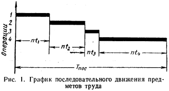 На рис. 1 представлен график последовательного движения предметов труда по операциям. Время обработки при последовательном виде движения предметов труда Тпос прямо пропорционально числу деталей в партии и времени обработки одной детали по всем операциям, т. е.