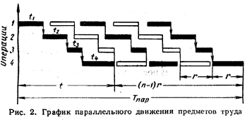При параллельном виде движения обработка (сборка) каждой детали (машины) в партии (серии) на каждой последующей операции начинается немедленно после окончания предыдущей операции, независимо от того что обработка (сборка) других деталей (машин) в партии (серии) на данной операции еще не окончена. При такой организации движения предметов труда несколько единиц одной и той же партии (серии) могут одновременно находиться в обработке (сборке) на разных операциях. Общая продолжительность процесса обработки (сборки) партии деталей (серии машин) значительно уменьшается по сравнению с тем же процессом, выполняемым последовательно. В этом заключается существенное преимущество параллельного вида движения, позволяющего значительно сократить продолжительность производственного процесса.