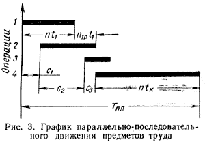Необходимость выравнивания (синхронизации) длительности отдельных операций существенно ограничивает возможность широкого применения параллельного вида движения, что способствует применению третьего – параллельно-последовательного вида движения предметов труда.