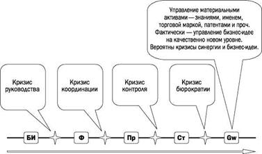 Кризис бизнес-идей или кризис синергии (пока не определен для российских предприятий, поскольку нет достаточной статистики). По-видимому, это будет кризис инноваций, кризис исчерпавшего свои потребительские качества продукта, кризис компетенций корпоративного центра, аналогичный кризису компетенций на фазе 1, но только на другом витке эволюционной спирали. Разрешением этого кризиса может стать привлечение новых компетенций и новых технологий, вызывающих изменение структуры нематериальных активов. Примером такого кризиса и попыток выйти из него может служить компания McDonalds: кризис fast food компания решает за счет введения инноваций и переориентации на другой сегмент рынка — рестораны для детей и их родителей. Многие западные эксперты отмечают, что компания McDonalds превратилась в крупнейшего разработчика, производителя и продавца тематических детских игрушек, сопровождаемых блюдами fast food, которые кроме вечно любопытных детей никто больше покупать не станет.