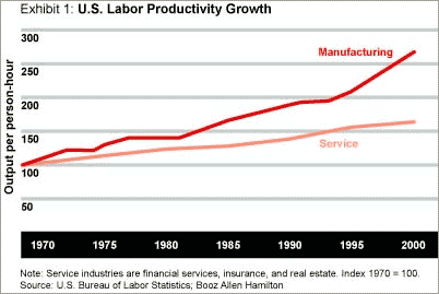 Чтобы оценить, как далеко еще могут продвинуться производственные отрасли и сектор услуг (финансы, страхование, недвижимость и пр.), мы сравнили информацию Бюро занятости по росту производительности с 1970 года (График 1). За последние 30 лет производительность труда в американских производственных компаниях практически утроилась, а в компаниях услуг выросла всего на 40 процентов.