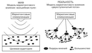 После открытия явления лидерства в области мнений были проведены исследования, показавшие, что в случае практически любой категории товара и услуги мнения 10 % тех, кого можно отнести к категории лидеров мнений, действительно формируют мнения и покупки 90 % той группы, которая следует за мнениями других [7]. Лидеров мнений можно определить как целевых покупателей, которые часто предлагают свои советы относительно определенной категории своему окружению или к которым люди из окружения обращаются за советом. К этой группе можно отнести известных специалистов в определенной отрасли, журналистов, критиков и знаменитостей. Тем не менее на любом целевом рынке подавляющее большинство лидеров мнений составляют просто постоянные клиенты — покупатели или потребители, которые обладают определенными связями с людьми и пользуются их уважением (рис. 1).