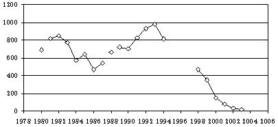 Численность казахстанской популяции сайги в период с 1980 по 2003 г. (данные Комитета лесного и охотничьего хозяйства Минсельхоза РК).(тыс. особей)