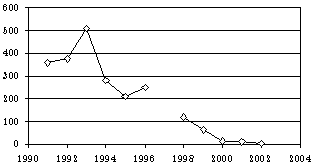 Численность бетпакдалинской популяции сайги в 1991-2001 гг. (данные Института зоологии и генофонда животных МОН РК, Алматы).(тыс. особей)