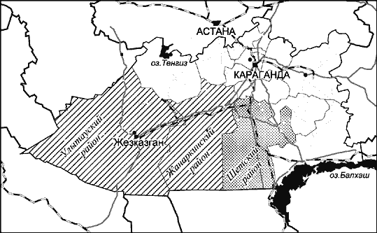* Территория бывшей Жезказганской области, расположенная в центральной части Казахстана; здесь сосредоточена большая часть ареала бетпакдалинской группировки сайги (см. карты ниже и на с. 25).