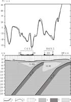 Модельный гравитационный разрез с двумя зонами субдукции показан на рис.3. Плотностное моделирование по профилю вкрест п-ова Камчатка свидетельствует о том, что в случае введения в модель двух относительно плотных погружающихся слоев с эффективной плотностью +0,08 : +0,1 г/см3