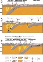 Начиная с конца олигоцена, в пределах Камчатки и Курил существовала система из двух дуг - Срединно-Камчатской и Южно-Камчатско-Курильской (рис.5). К югу от стыка с Алеутской дугой формирование системы было обусловлено субдукцией Тихоокеанской плиты, а к северу - молодой Командорской плиты. Эти дуги в современной структуре маркируются соответствующими формационными комплексами вулканических пород (см. рис.1) и гравитационными аномалиями фронтальной дуги (см. рис.2).
