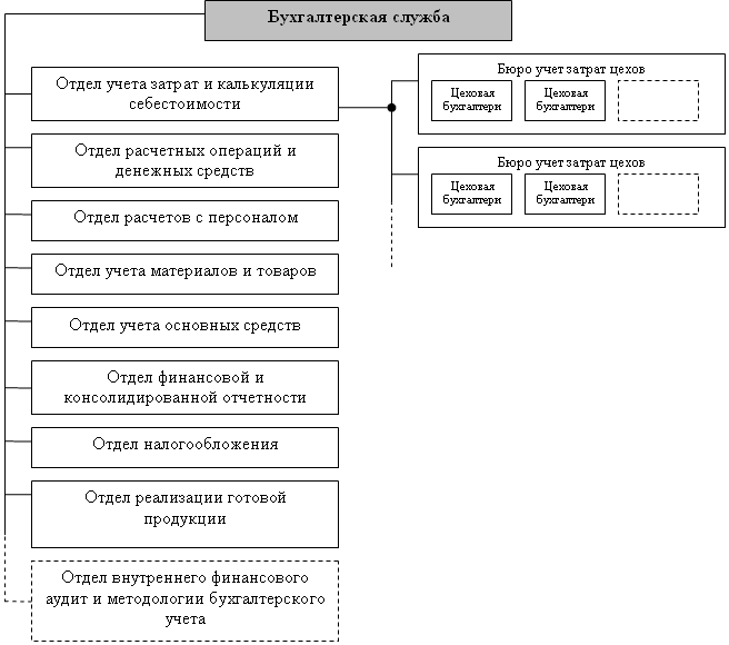 Структура бухгалтерской службы зависит от вида деятельности, размеров предприятие и т.д. Наиболее важные и большие участки учета выделяются в отдельные подразделения (отделы, бюро). Далее будет предложена структура бухгалтерской службы для крупного производственного предприятия.