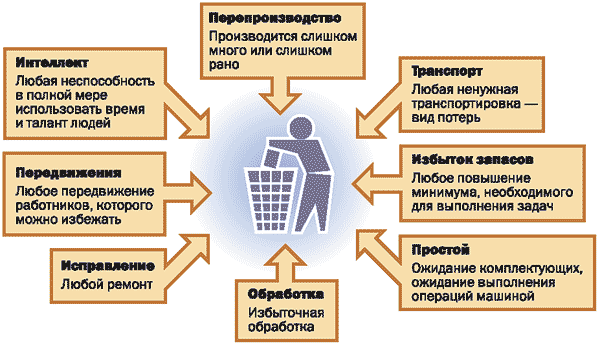 Под потерями подразумевается любая деятельность, которая, не создавая стоимость, увеличивает издержки, застопоривает поток продукции или информации и мешает удовлетворять потребности клиентов. Иными словами, это та деятельность, за которую клиенты не должны платить. Выделяют восемь видов потерь (см. схему 2): перепроизводство, ненужные передвижения и перевозки, ремонт любого рода, избыточная обработка, простои, вызванные ожиданием (пока доставят нужные комплектующие или машина завершит цикл обработки), избыток материально–производственных запасов, неполное использование интеллектуальных ресурсов. Максимально исключив потери, компании могут снизить издержки и получить конкурентное преимущество.