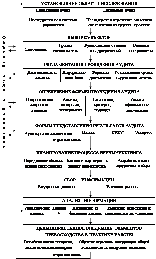 При реализации бенчмаркинговой стратегии внутренний аудит рекомендуем регламентировать. Для разработки подобного рода регламентов могут быть использованы уже имеющиеся методики, ряд который успешно опробован в практике отечественных предприятий. Однако все они имеют не только преимущества, но и целый ряд недостатков, к примеру, использование инструментов, требующих значительных временных затрат или крайне высокой квалификации персонала, большего объема информации. Нам представляется более приемлемым применительно к особенностям хозяйствования отечественных предприятий аудит проводить на базе методики, предложенной Ф. Котлером, в которой предполагается оценка эффективности маркетинга по основным составляющим маркетинговой ориентации, дополненными нами отдельными уточняющими вопросами, учитывающими необходимость применения бенчмаркинга.