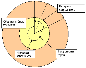 Этот конфликт интересов может иметь как конструктивное, так и деструктивное развитие. Деструктивное - это забастовки, в т.ч. "итальянские", массовые увольнения, а конструктивное - повышение производительности труда и формирование оптимальной компенсационной системы, позволяет вывести развитие этого конфликта интересов в позитивное русло. Решение продемонстрировано на рис.1 и заключается в следующем: менеджмент компании заинтересован в относительном уменьшении издержек на персонал, а сотрудники в абсолютном увеличении доходов. На рис. 1 меньший круг показывает исходную ситуацию конфликта, а больший - позитивное развитие.