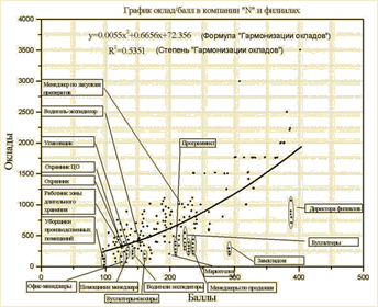 Коэффициент гармонизации, как, впрочем, и формулу гармонизации окладов, соответствующую вашей компании можно определить, построив график, аналогичный приведенному ниже.