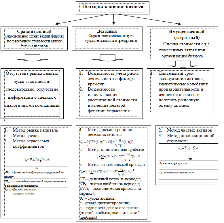 Применительно к целям управления стоимостью предприятий сферы потребительского рынка основным недостатком доходного подхода является отсутствие количественно определенной связи целевой функции с факторами ее роста (денежными потоками, риском и др.). Опосредованная связь через стоимость акций менее достоверна из-за влияния текущих ожиданий фондового рынка. Однако принцип рыночного подхода, состоящий в сравнении различных предприятий по совокупности их характеристик, может быть использован, если в качестве базы брать оценки стоимости, полученные методами доходного подхода.