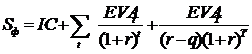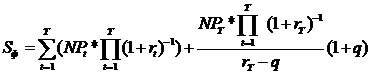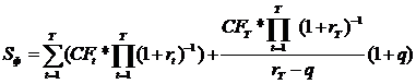 Первое слагаемое формулы представляет собой стоимость, инициированную денежными потоками прогнозного периода, второе –денежными потоками послепрогнозного периода, растущими с темпом q.