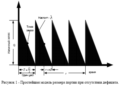 Рассмотрим простейшую модель размера партии при отсутствии дефицита на одиночной базе при условии, что спрос детерминирован, и интенсивность поступления требований равна λ единиц в год вне зависимости от времени. Предполагаем, что время поставки τ постоянно и не зависит от λ и размера заказа. Заказ поступает в виде одной партии. Будем считать, что товар может храниться неограниченное время и что он не устаревает. Тогда удобно считать, что система будет продолжать работать и в будущем. Очевидно, что если данная система функционирует оптимально, то при подаче заказа каждый раз заказывается одно и то же количество товара, а уровень наличного запаса в момент поступления пополнения всегда один и тот же. Минимизация издержек обеспечит отыскание той же самой стратегии функционирования, что и максимизация прибыли. Оптимальная стратегия функционирования будет определяться из условия минимума средних годовых издержек.
