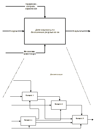 Для точного и подробного описания деятельность компании и возможности разбить такую деятельность на составные части, мы используем стандарт IDEF 0, который был разработан в США в рамках подготовки программы разработки "шаттла". Применение этого стандарта позволило увязать деятельность более чем 3 тысяч фирм - разработчиков, поставщиков, производителей, сервисных и финансовых организаций.