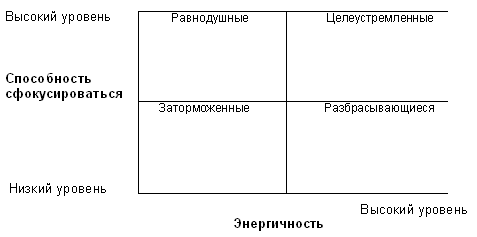 Менеджеры, обладающие обоими этими качествами, но в недостаточной степени, послушно выполняют рутинные задачи, однако они не способны проявить инициативу и поэтому «тянут резину». Равнодушные менеджеры обладают высокой способностью фокусироваться, однако они крайне пассивны: просят дать им фронт работ, а выполняют задания вполсилы. Разбрасывающиеся менеджеры деятельны, но «без царя в голове»: они не чувствуют разницу между бурной активностью и конструктивными действиями. И только целеустремленные менеджеры, которых отличают и энергичность, и умение сосредоточиться на решаемых задачах, достигают максимального результата.