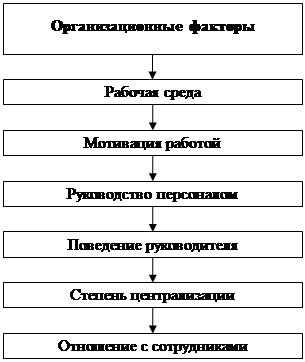 Организационные факторы характеризуют качество организации работы и влияют на мотивацию труда всей организации. К организационным факторам, влияющим на развитие компетенций, относится: рабочая среда, которая рассматривается как организационные коммуникации. Руководителю необходимо планировать мотивацию работой так, чтобы обеспечить успешную работу в компании, что подразумевает эффективное руководство персоналом с устойчивыми «обратными связями», при этом руководитель максимально мотивирует свое поведение, создавая мобильную команду. Степень централизации отражает взаимосвязь власти и управленческого решения, которая обеспечивается отлаженной системой принятия непротиворечивых решений по управлению экономическими, социальными процессами в интересах организации. Отношения с сотрудниками определяются атмосферой доверия и являются неотъемлемой частью общей концепции управления персоналом.