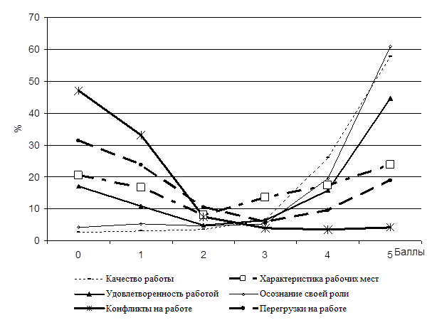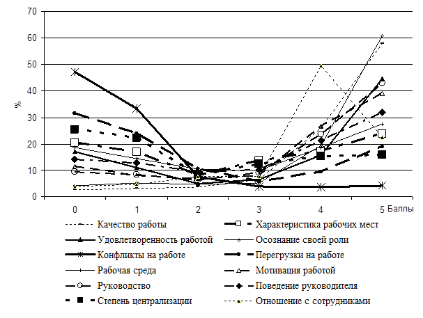 Из таблицы (1) видно, что качеством работы удовлетворены около 84% работников ОАО "Кубаньэнерго". По отношению к характеристике рабочих мест персонал разделился: более 37% не согласны с условиями рабочего места, более 41% согласны работать в данных условиях. По степени удовлетворенности: 28% не удовлетворены, более 60% удовлетворены работой. 9,5% не осознают свою роль, а почти 81% вполне осознают свою роль на рабочем месте. Работники, которые не осознают свою роль на рабочем месте, как правило, более конфликтны ( свыше 80%).