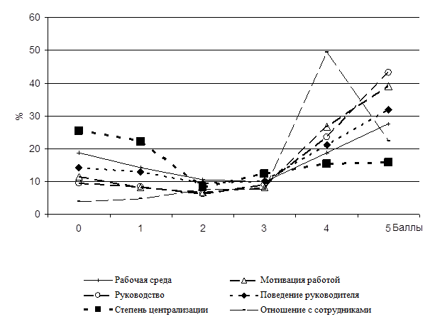 По отношению к коммуникативному пространству (фактор – рабочая среда), как и в случае функциональных факторов, можно выделить три группы респондентов: в первую входят респонденты, отрицательно и пессимистически относящиеся к своему окружению (23%), во вторую – респонденты, полностью удовлетворенные той рабочей средой, в которой они общаются (45%). В третью группу входят респонденты, которые лояльно оценивают рабочую обстановку.